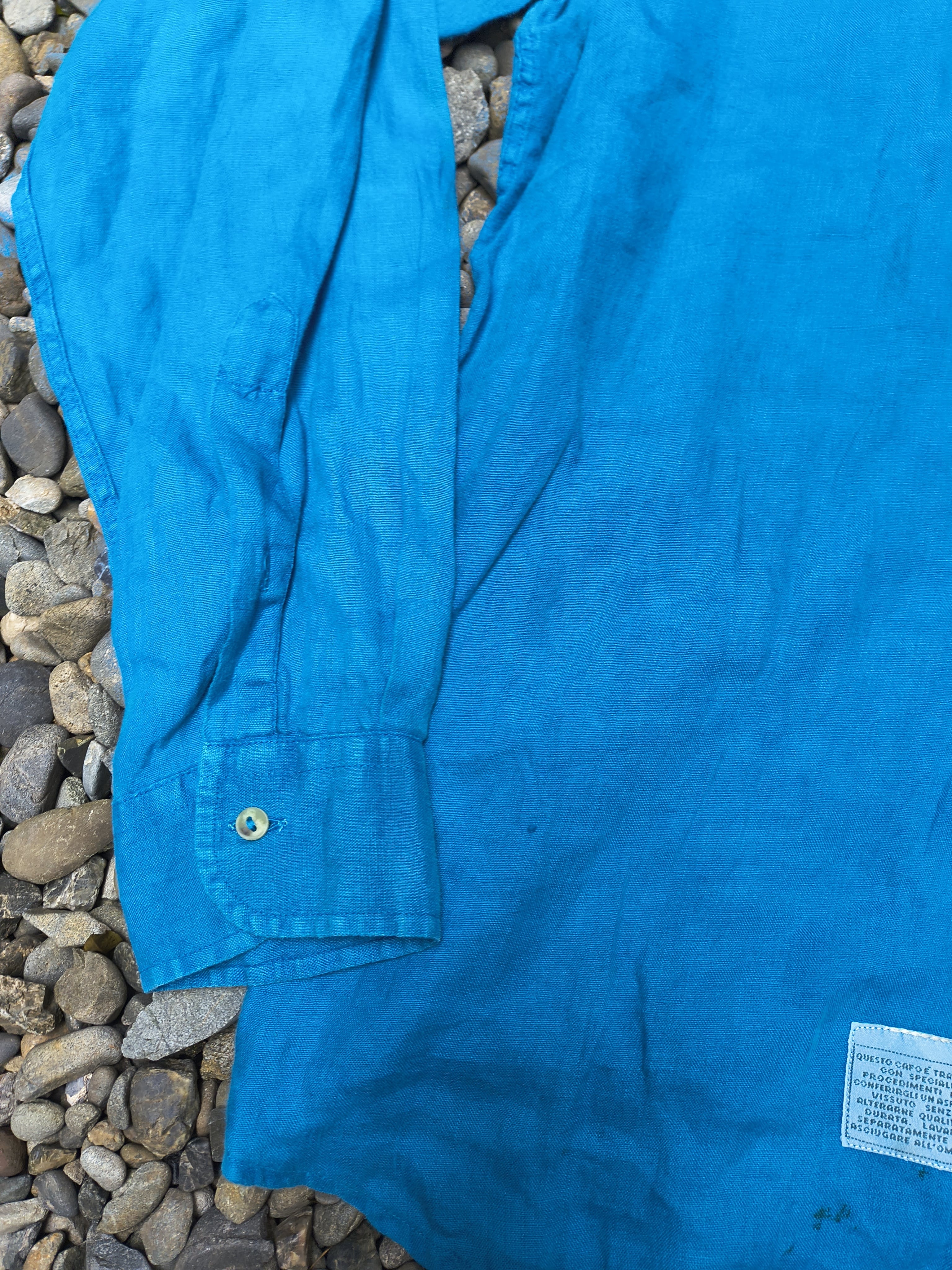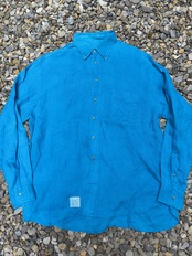 鮮やかなブルーのリネンシャツ。